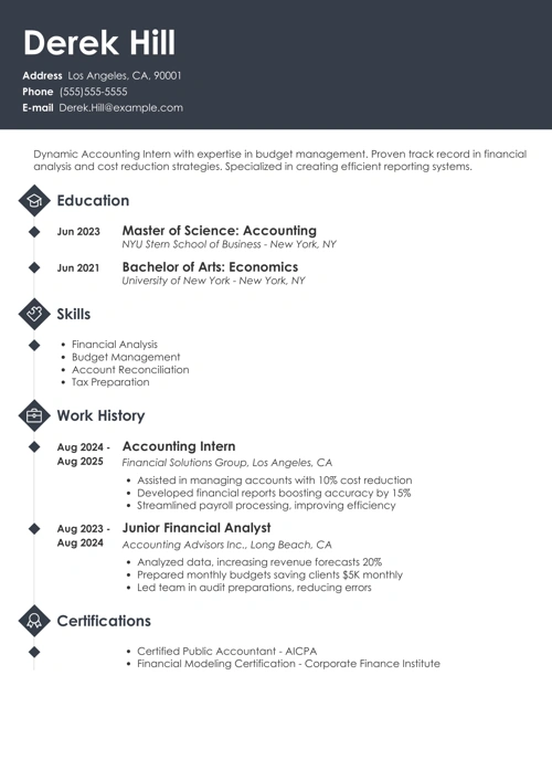 An accounting intern puts their knowledge into practice while doing some general accounting work. It ranges from entering data through financial reporting to preparing taxes. What’s the goal of your resume, then? To prove that with your skillset and strong character, you’re ready to excel at it.