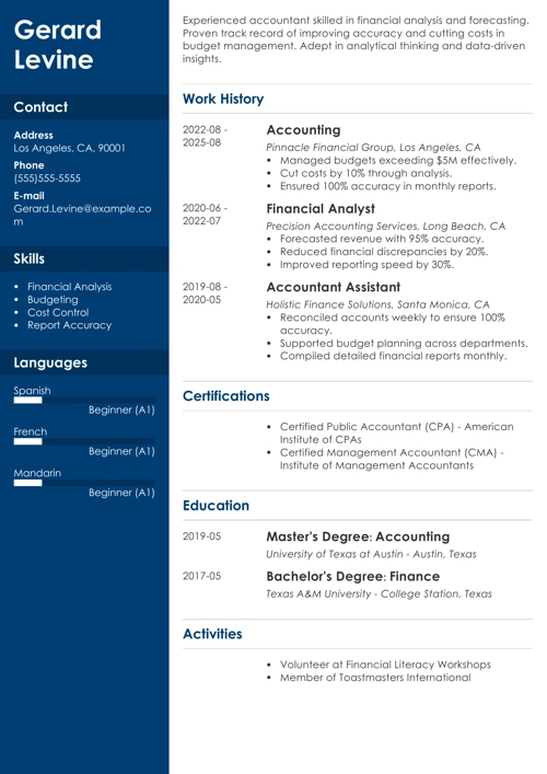 - Resume Format: Use the reverse-chronological format to highlight your most relevant accounting experience first.