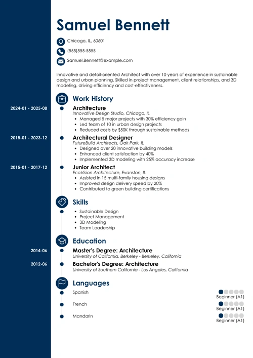 Use a trusted resume design like reverse-chronological. It’s the best architecture resume format because it puts your biggest wins up front.