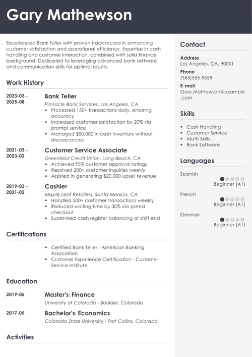 - Use resume action verbs to start each bullet point, and always tailor resumes to match the bank teller job requirements.