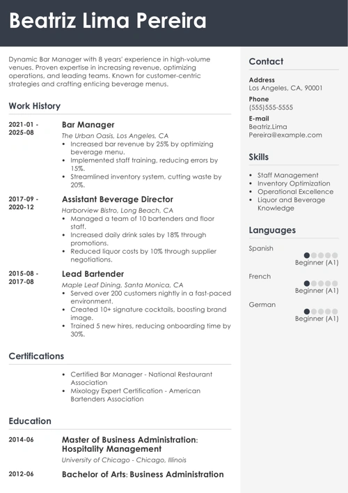 - Show off quantifiable achievements, not just standard bar manager job duties.