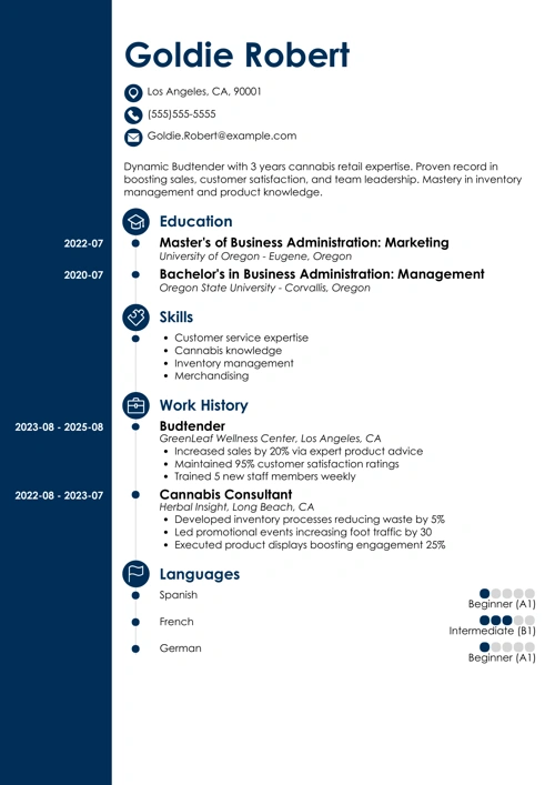 Take a look at this budtender resume example that we’ll break down step-by-step.