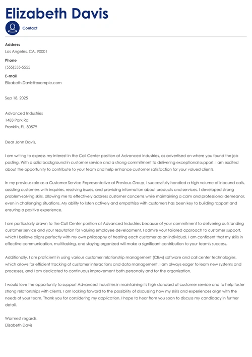 Even the best call center representative cover letter is worthless without a great call center resume alongside. Read this guide to make sure yours is ready: Call Center Resume Sample & Writing Guide.
