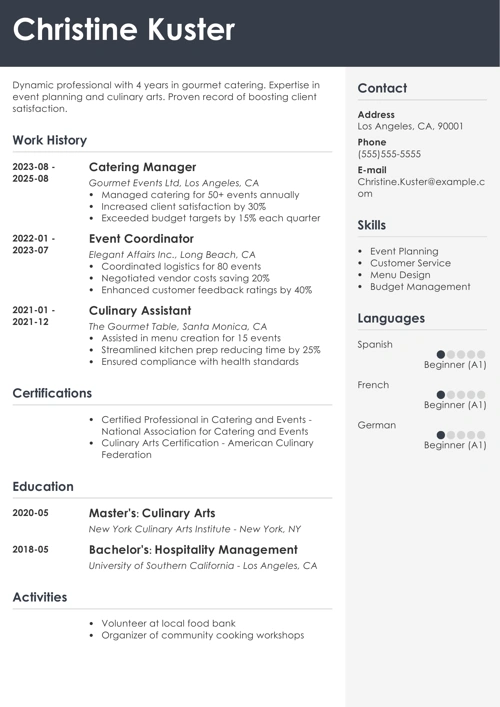 - If you have relevant coursework (e.g., culinary management, catering logistics), add them as a subsection.