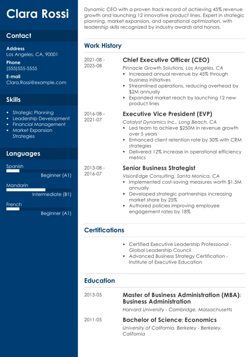 Pro Tip: Relevant coursework for a CEO doesn’t just mean business management and leadership classes. If you have, add coursework related to the industry to which you are applying.