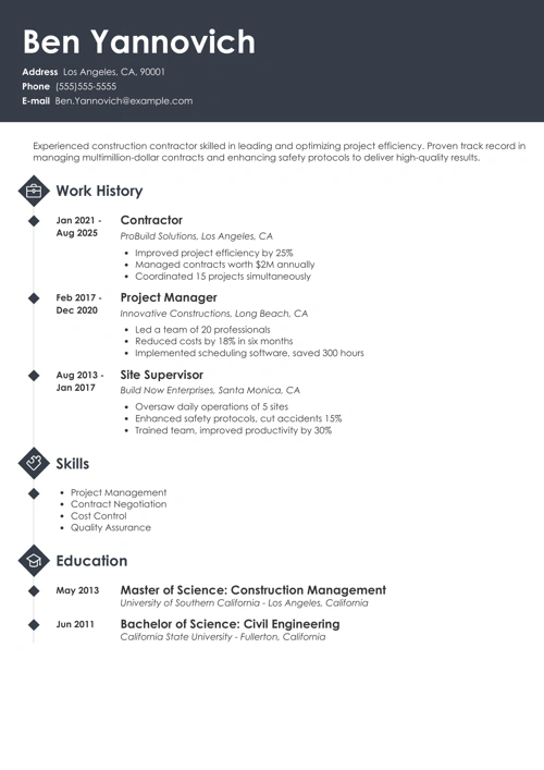 Pro Tip: Want the hiring team to read more of your general contractor resume? Use strong resume verbs like resolved, created, and exceeded to make it happen.