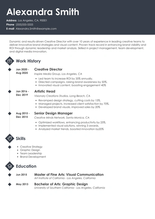 Capture the attention of hiring managers with a compelling creative director resume introduction. Since they often spend only a few seconds on each resume, it’s crucial to make an impact right away.