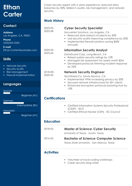 This format keeps your cyber security resume in order like a great security policy framework. Hiring managers and security agency staff love this format for being familiar and easy to follow.