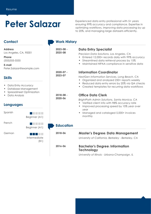 Want to double-check if reverse-chronological is really the best format for a data entry resume? See our guide: 3 Resume Formats: How to Choose the Best One [Examples]