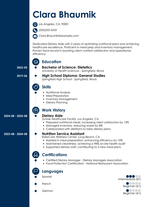 Pro Tip: “How long should my resume be for dietary aide jobs?” Always, always one page. Less looks lazy, while a longer resume will make the hiring team gloss over your accomplishments.