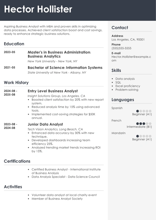 - Make your entry-level business analyst resume one-of-a-kind by adding several extra sections like certifications, hobbies and interests, or knowledge of foreign languages.
