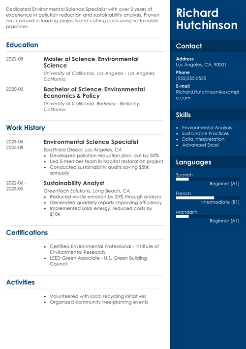 With less experience, you’ll want to elaborate. For entry-level environmental science resumes, add more elements, like: