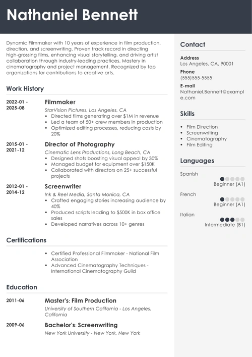 Let’s create a filmmaker resume that makes hiring managers eager to cast you in the leading role of their next big production.