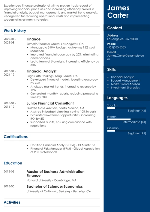 - Don’t forget about your certifications! They’re essential, especially if you’re aiming for roles like finance director, financial analyst, or finance manager.