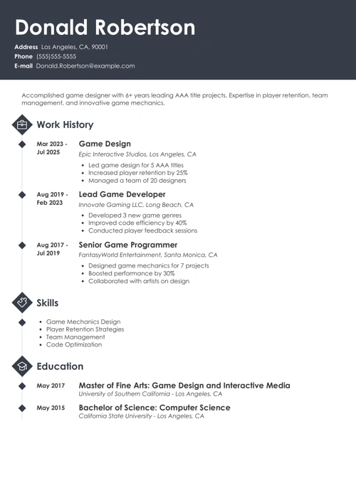 Pro Tip: If you’re unsure whether or not you got everything in order in your video game design resume, check out our guide on resume dos and don’ts.
