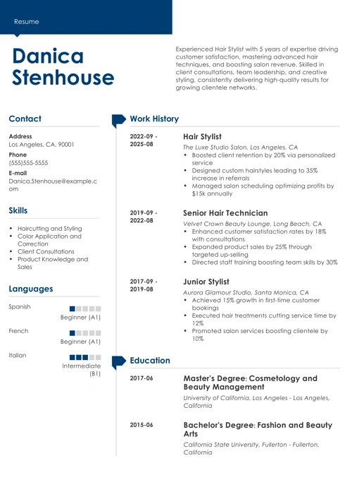 Pro Tip: Switching to the hairstylist world from another line of work? Try the combination resume format for your hairdresser resume. It blends in transferable experience from other jobs.
