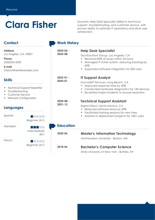 Been on a help desk team before? Fantastic! You’ve got an advantage. The reverse-chronological format is best for your experienced help desk resume.