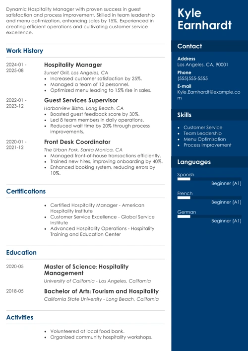 If you need resumes for specific hospitality jobs, see the guides and samples below—you’ll find resume examples for hospitality jobs in restaurants, hotels, and other establishments.