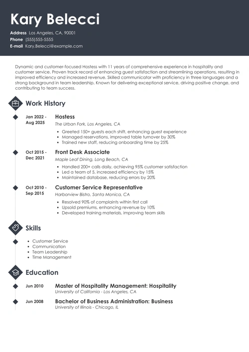 Check the other options for your hostess resume format. See our guide: 3 Resume Formats: How to Choose the Best One [Examples]