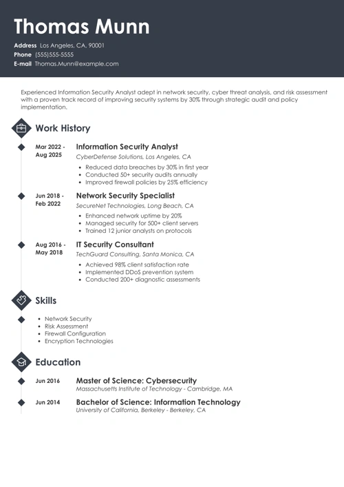 And, if you haven’t worked in InfoSec, a strong resume objective works best. Cast the light on any useful transferable skills you have that fit the profile of an entry-level information analyst, and state your career goals.