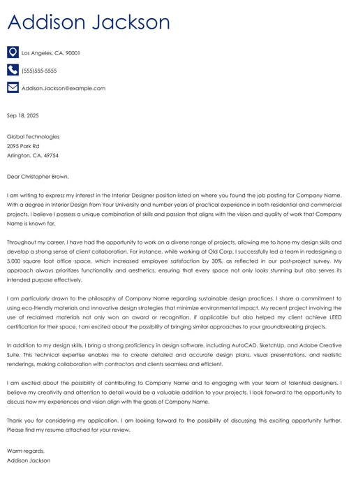 Your chic cover letter needs an equally refined resume. See our guide: Interior Design Resume: Sample & Complete Guide