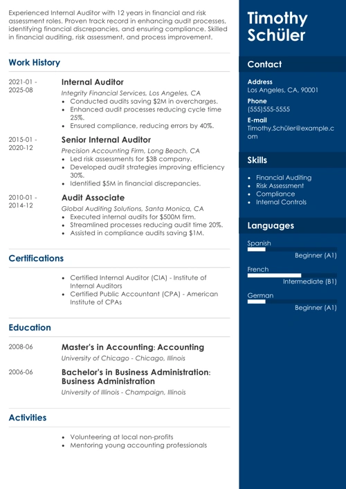 With more than 2 years of internal auditing experience, you’ll want to write a resume summary. You present your most impressive skills and add numbered achievements to convince the company you’re clearly the right fit for the job.