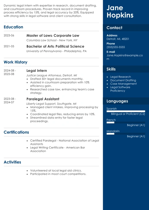 - Put all relevant internships and extracurricular activities in your education section to showcase practical experience in the legal field.