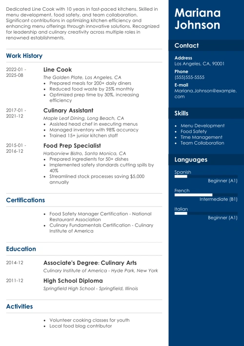Here’s a sample resume for a line cook made using our resume builder.