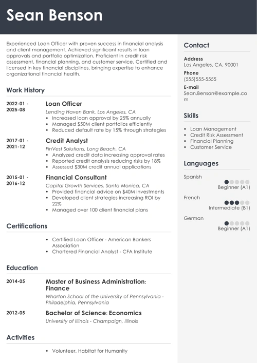 A career summary focuses on your professional experience and achievements. It works best on a senior loan officer resume or if you have at least 2 years of relevant experience.