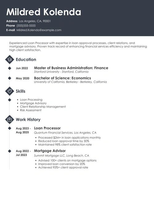 Pro Tip: If you just graduated, make the education section longer in a resume for loan processor jobs. You can list a senior project so it looks similar to a job.