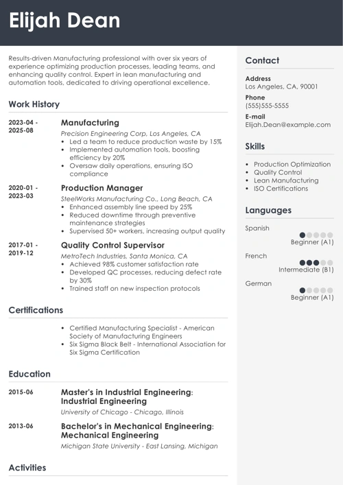 Manufacturing Resume Example