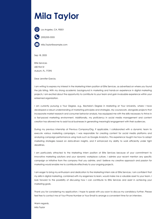 This guide will show you a marketing intern cover letter sample, as well helpful tips on how to write a cover letter for marketing internship jobs when you have no experience.