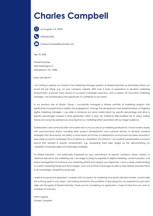 Here’s our idea of the perfect sample marketing manager cover letter:
