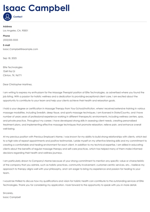 This guide will show you a massage therapist cover letter example, plus the best tips on how to write a great massage therapist cover letter.