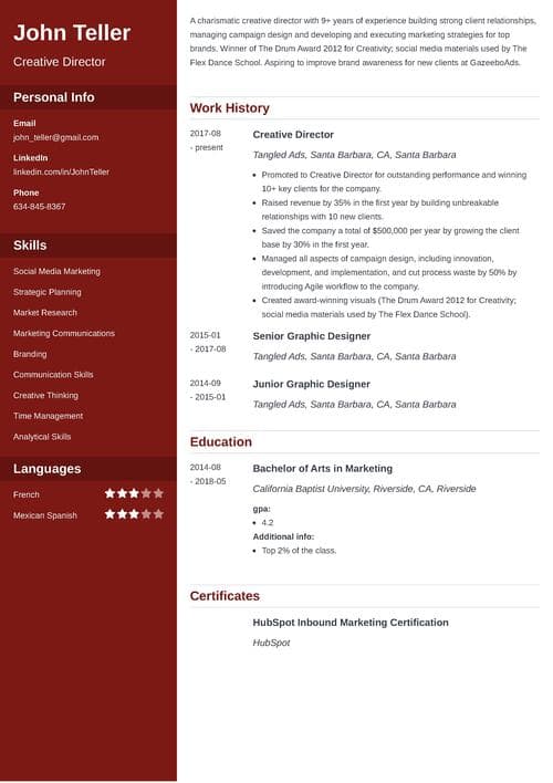Summarizing early job titles within one bullet and highlighting those that will potentially make a bigger impression on a hiring manager, looks pretty good, doesn’t it? Also, the key achievements are typical for the Creative Director position, as it is the most recent, the most relevant, and the most impressive. The job responsibilities are very different when you become a director, hence focus on accomplishments related to the latest position. So, what’s the last bullet point doing there? Well, it’s also impressive! And even though it comes from the previous position, it’s definitely worth mentioning!