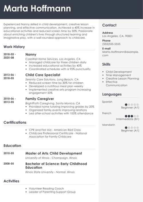 - Prove your nanny skills on a resume by showing them in your experience and education bullet points.