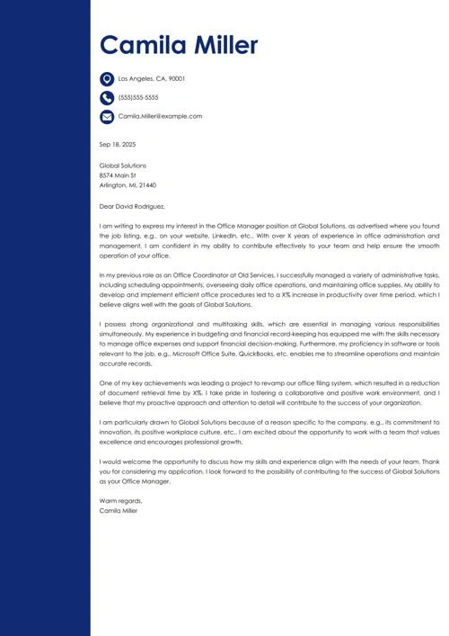 Pro Tip: As you did on your office manager resume, use keywords here, as well. Follow wording you see in the job description to maximize impact. Also, choose the best fonts to keep your office management cover letter legible!
