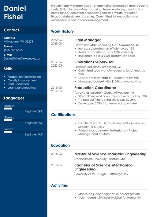 Plant Manager Resume Example