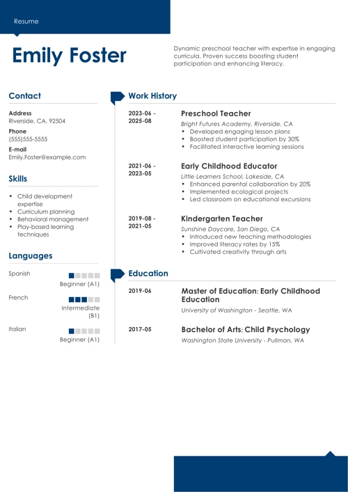 Pro Tip: Switching into preschool teaching from some other job? Consider the combination resume format. It pulls in relevant highlights from your work experience.