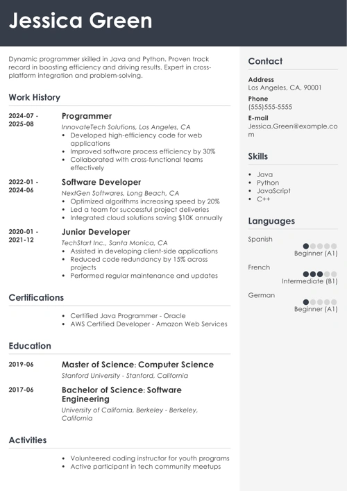 Use the respected, elegant reverse-chronological format. It’s the best programmer resume template. Why?