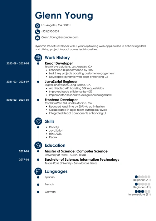 React developers craft and implement UI components to integrate them with JavaScript web applications. They are involved throughout the entire lifecycle of the project, often utilizing Flux to streamline workflow. The best React developer resumes will show attention to detail and problem-solving skills alongside relevant experience.