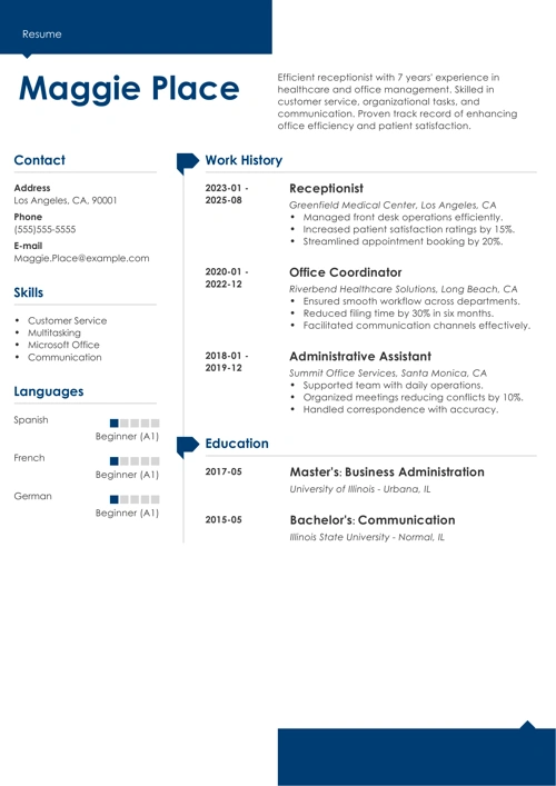 - How to write a receptionist resume in our builder and land more interviews.