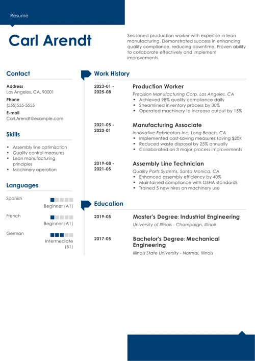 A production worker plays a vital role in manufacturing by performing tasks such as machine operation, assembly line work, and packaging of finished products. A good production worker’s resume must highlight attention to detail, mechanical aptitude, and teamwork.