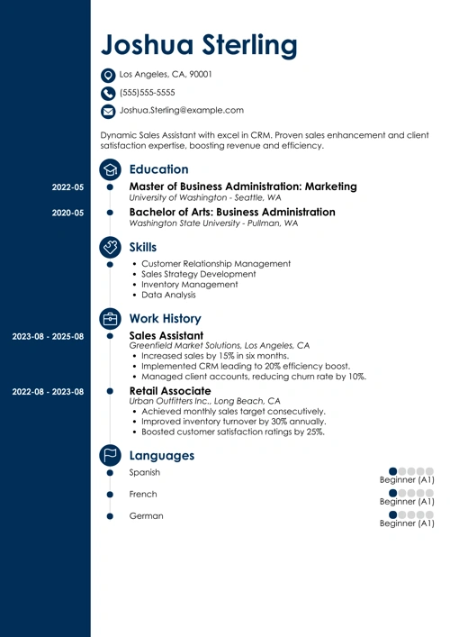 Pro Tip: Include keywords and phrases from the job description in your sales assistant resume. It’s a perfect way to show relevancy and fit for the role. It also proves that you have a strong understanding of the position and its requirements, making you a more competitive candidate.