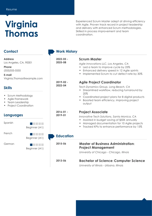 Your Scrum Master resume needs to be easy to navigate—the hiring managers spend just 7 seconds initially looking at a resume. You have just a moment to make a strong first impression, and the clear resume structure that the chronological resume format provides will help you achieve this goal.