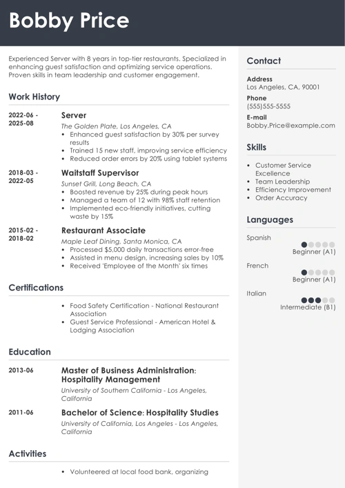 Adding extra sections can enhance your resume, whether you are applying for an entry-level server position or aiming for a more senior role.