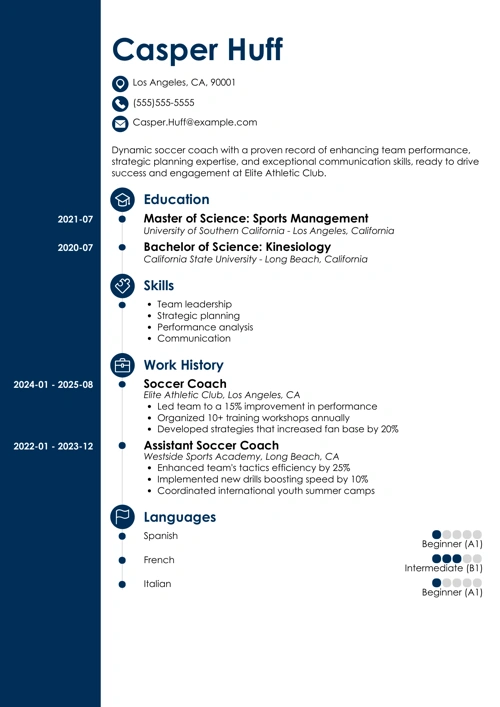 Pro Tip: In general, a soccer resume should be one page in length unless you’ve got so many (10+) years of experience and enough achievements to fill two pages