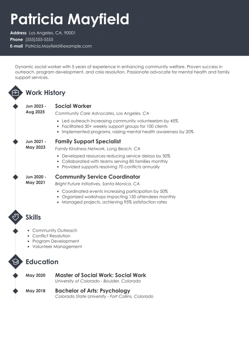 Pro Tip: Moving to social work jobs from another career? Use the combination resume format. It integrates transferable experience into your social worker resume.