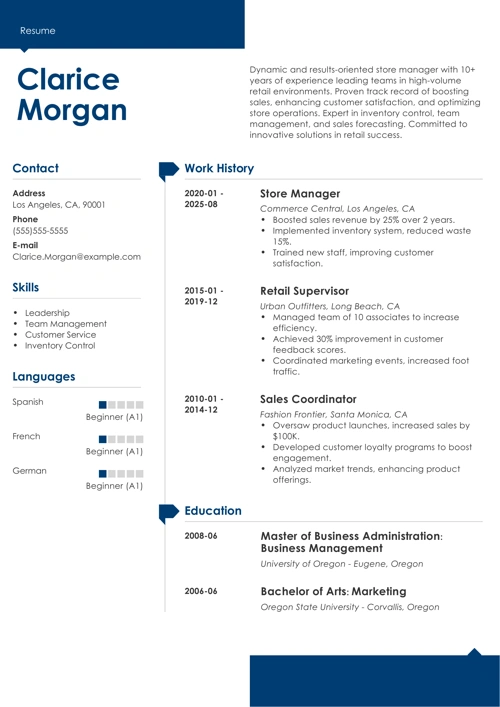 Here’s what to include in a good reverse-chronological store manager resume, from top to bottom.