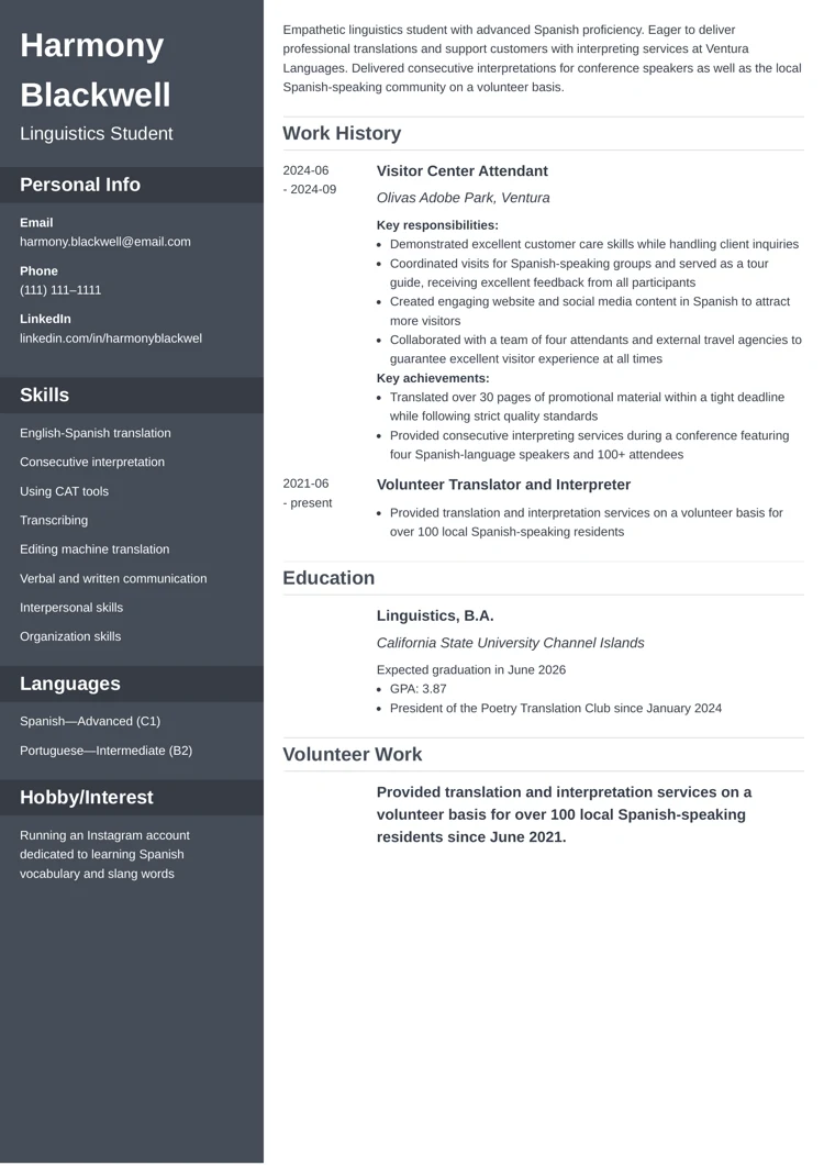 Not all employers want to hire students, so you must appear professional. Trust me, starting your resume with a profile summary that features relevant experience and knowledge is a great way to convince you’re qualified for the job. Additionally, each section of this student resume example features transferable skills that are essential to many entry-level and part-time jobs. Plus, this simple resume design is our users’ favorite, as it appeals to all industries and positions.